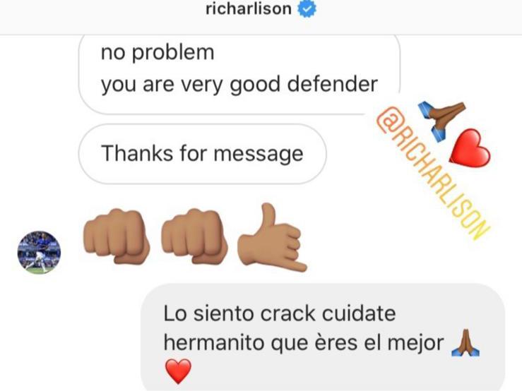 Il difensore del Manchester United ha usato i direct message di Instagram per chiedere scusa al brasiliano dell’Everton: “Mi dispiace, stai attento fratellino, sei il migliore“, ha scritto l’ivoriano in un messaggio privato. Richarlison ha dimostrato di non portare alcun tipo di rancore nei confronti dell’avversario: “Nessun problema, sei un ottimo difensore, grazie per il messaggio“, ha risposto prontamente. Una bella storia di fair play tra due giocatori che si rispettano dunque. Il tutto in salsa social, ovviamente…
